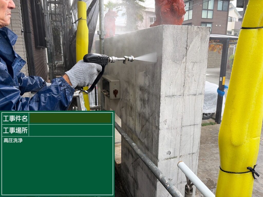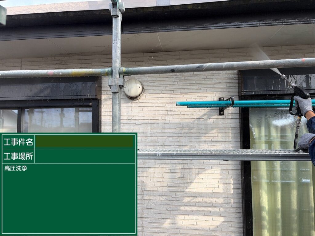 お家に付着したホコリ・排気ガス汚れ・カビ・苔などを高圧の水で丁寧に洗い流し、塗装に適した清潔な下地を整えます。汚れを残すと塗料の密着が低下するため、目地やサッシ周りなど細かい部分までしっかり洗浄し、長持ちする塗装の基礎をつくります。
