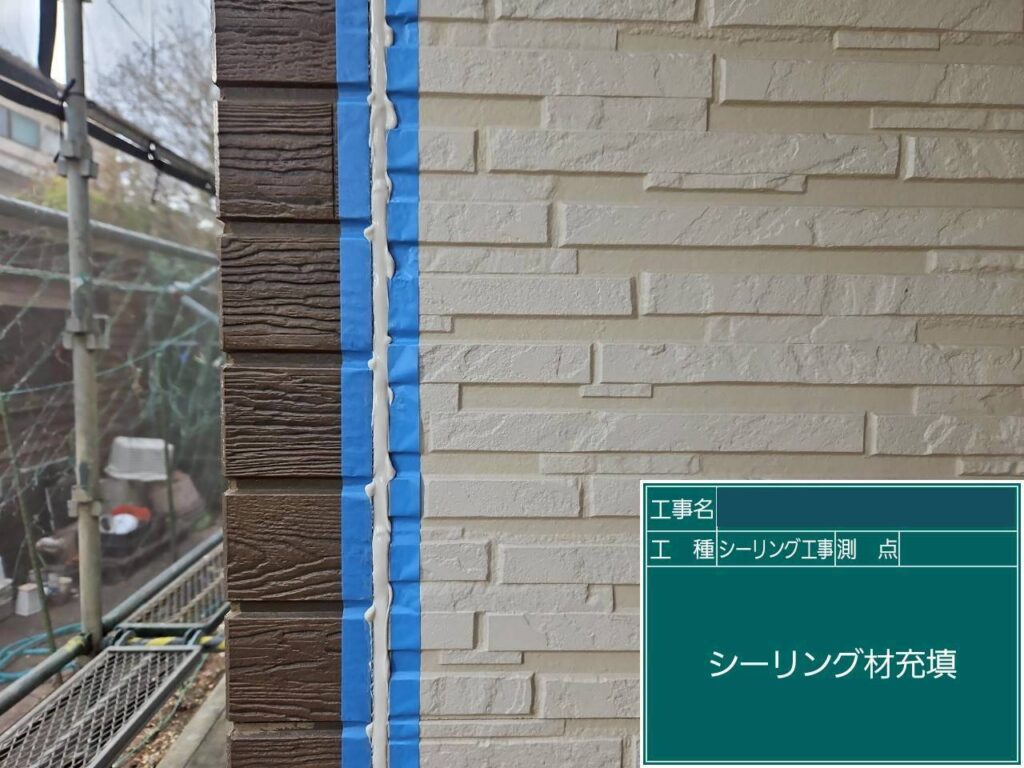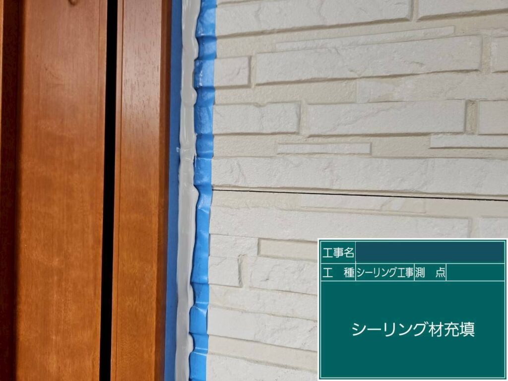 廻りのシーリングも、建物の防水性に重要な部分ですが、この部分は通常「打ち増し」と呼ばれる工法を用いて補修します。外壁目地のシーリングが「打ち替え」なのに対し、「打ち増し」は既存のシーリングを撤去せず、上から打ち増して止水性を高めます。サッシ廻りのシーリング撤去作業は、サッシ自体に傷を付ける可能性があること、またサッシに付属する防水テープを破断するなど二次被害を誘発する恐れがあるためです。清掃のみ行い、その上からプライマーを塗布します。その後、シーリング剤を充填していきます。施工写真にある青の部分は「養生」です。養生なしに作業を進めると、外壁材に付いて硬化すると取れにくため、十分な下処理、下準備をしてシーリングを充填します。