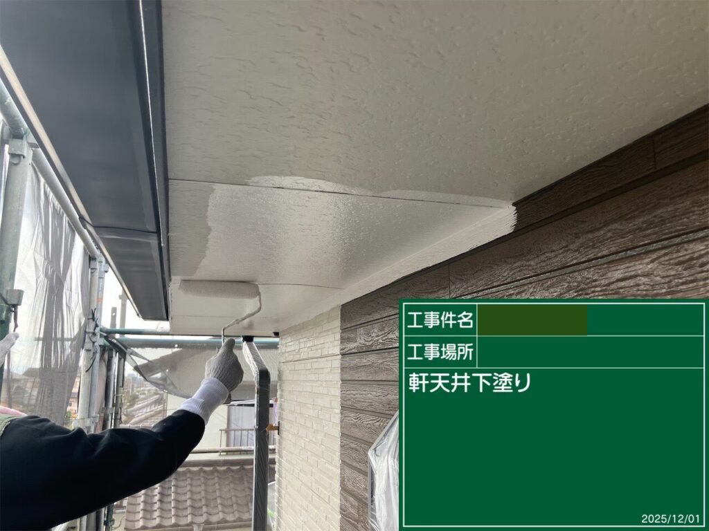 軒天の塗装は基本的に2回を行います。 軒天には、屋根からの雨水が直接壁面に当たるのを防ぎ、建物内部へ雨水の侵入を防ぐという大きな役割があります。2度の上塗りで、役割を果たすために十分な厚みのある塗膜をつくります。白系の明るい色で塗装することで、お家全体の印象が明るくなります。