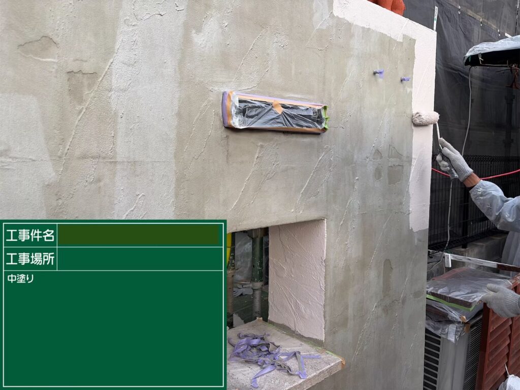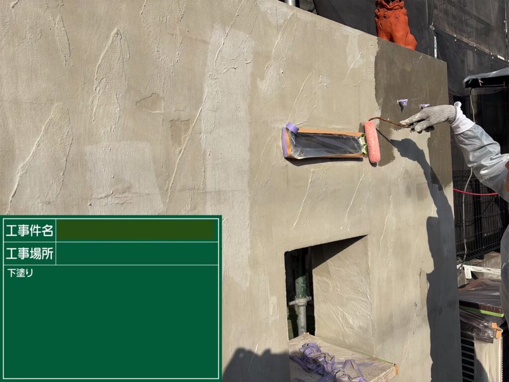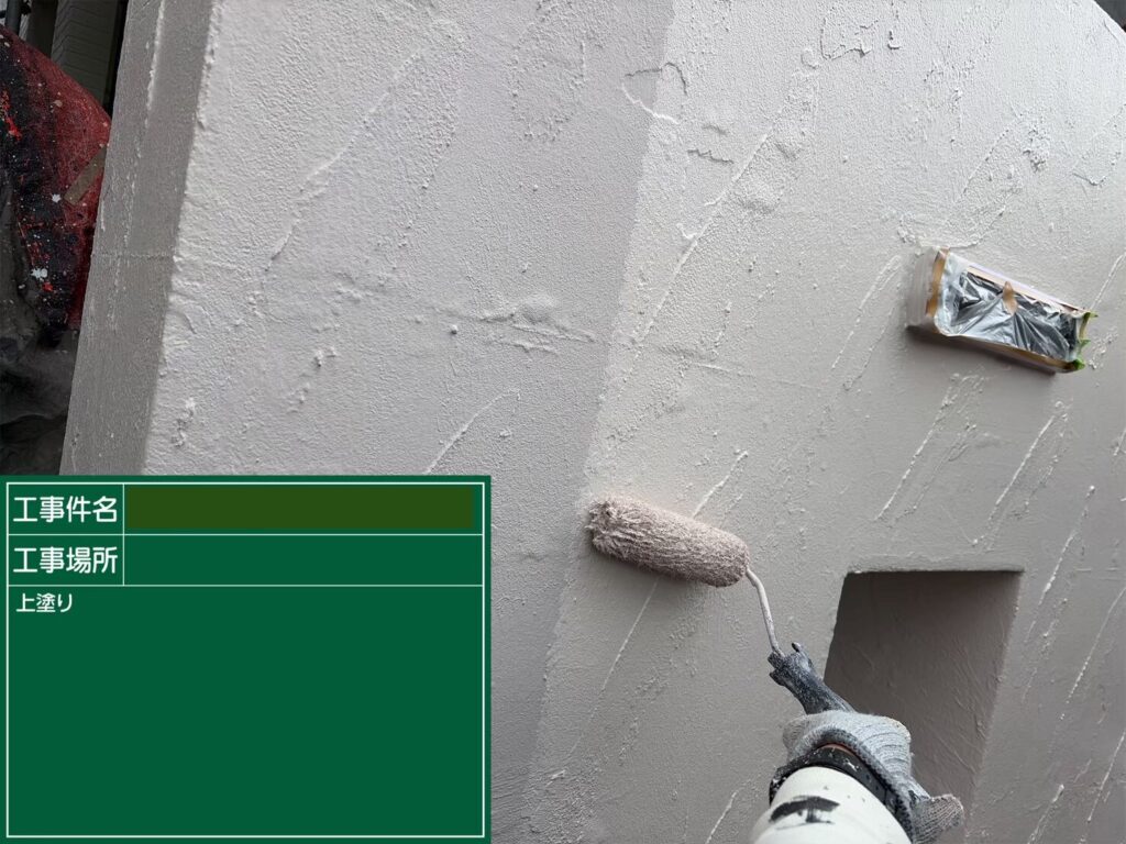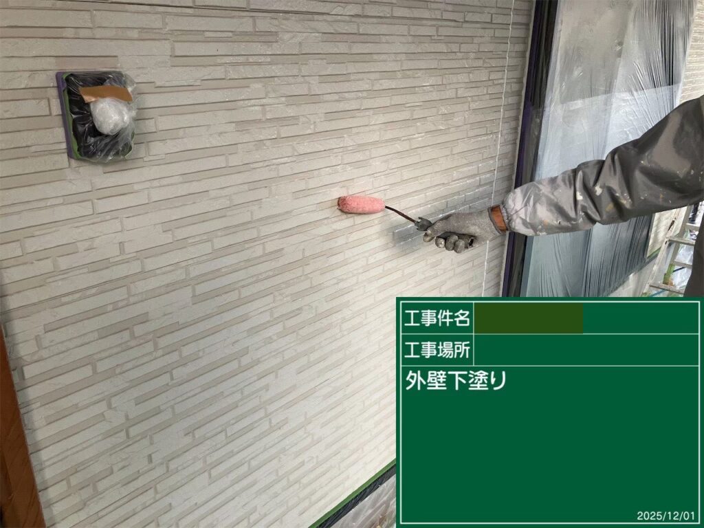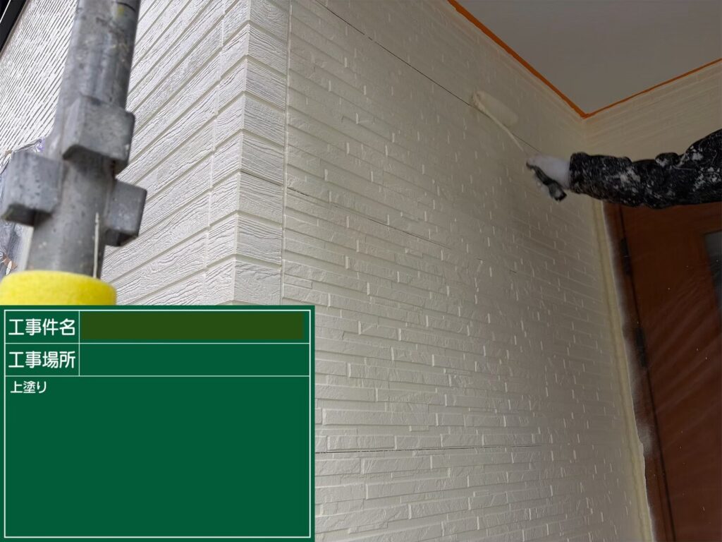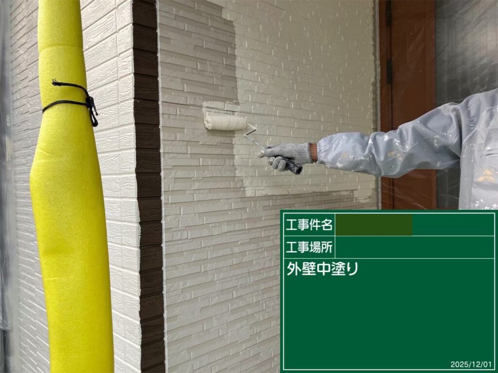 外壁塗装の工程です。まず「下塗り」は塗装の仕上がりや耐久性を決める重要な工程です。下塗りを省略すると、仕上げ塗料が外壁に十分に密着せず、さまざまなトラブルの原因となります。「中塗り」とは、下塗りと上塗りの間に行う塗装作業のことです。塗装面のムラや凸凹を均一に整えたり、塗料の耐久性・密着性を高めたりなど、より高品質な上塗り(仕上げ)にするためのサポート的な役割を持っています。最後に「上塗り」です。上塗りは外壁の見た目や保護性能を決定づける役割を持つため、全工程の中でも特に重要です。上塗りが適切に施されなかった場合、気泡や色ムラができたりと見た目を損なう可能性がありますが、下塗り・中塗りの上からさらに重ね塗りすることで、ムラのない均一で美しい外壁に仕上がります。今回使用した塗料はアステック社のリファインMF【ホワイトリリィ】です。