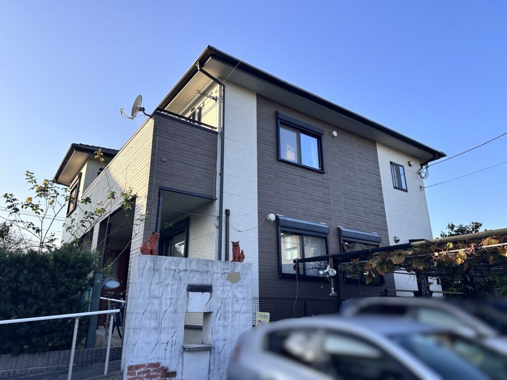 ベージュ×茶のツートンから、白味を抑えたやわらかな白のワントーンへ一新。付帯部の黒が程よいアクセントとなり、外観を引き締めています。塗料は超低汚染塗料で人気の、アステック社「リファインMF」を採用し、優れた防汚性と高耐候性により、美観を長く維持できる仕上がりになった施工事例です。