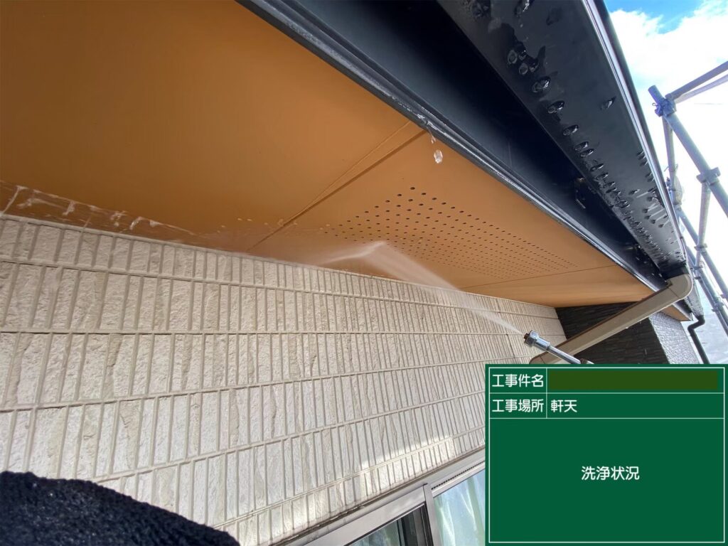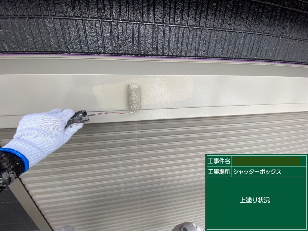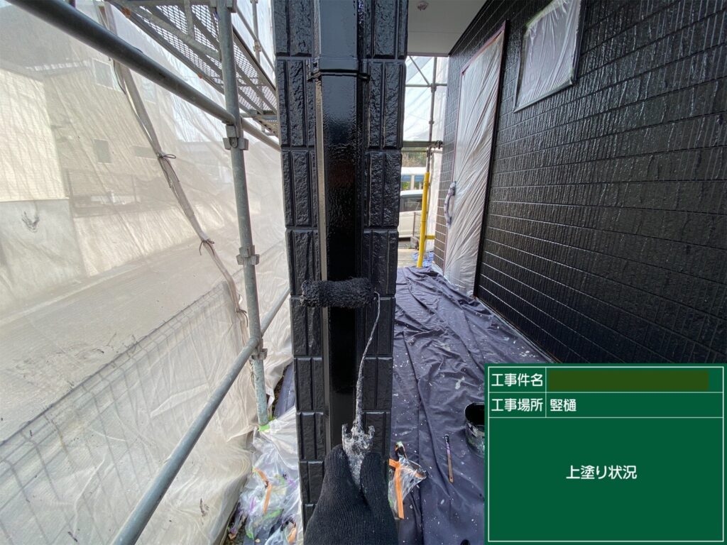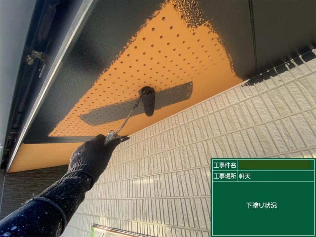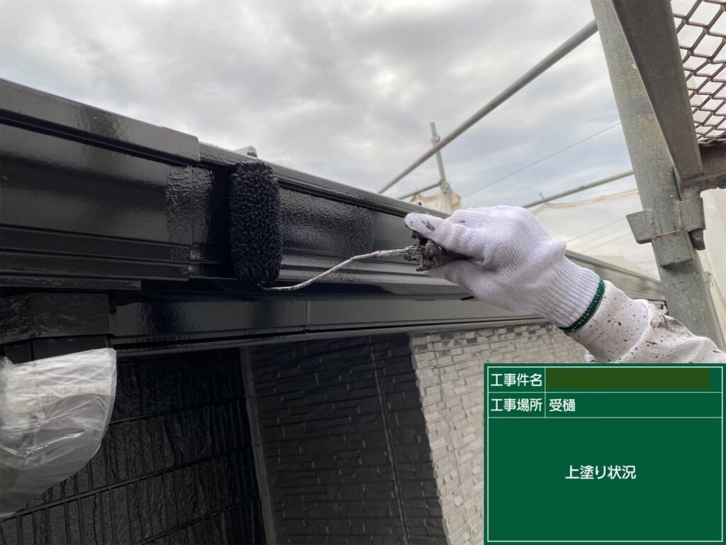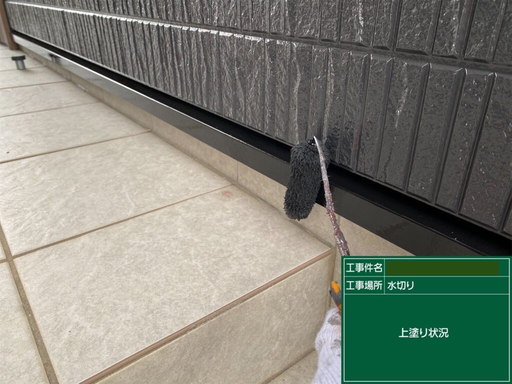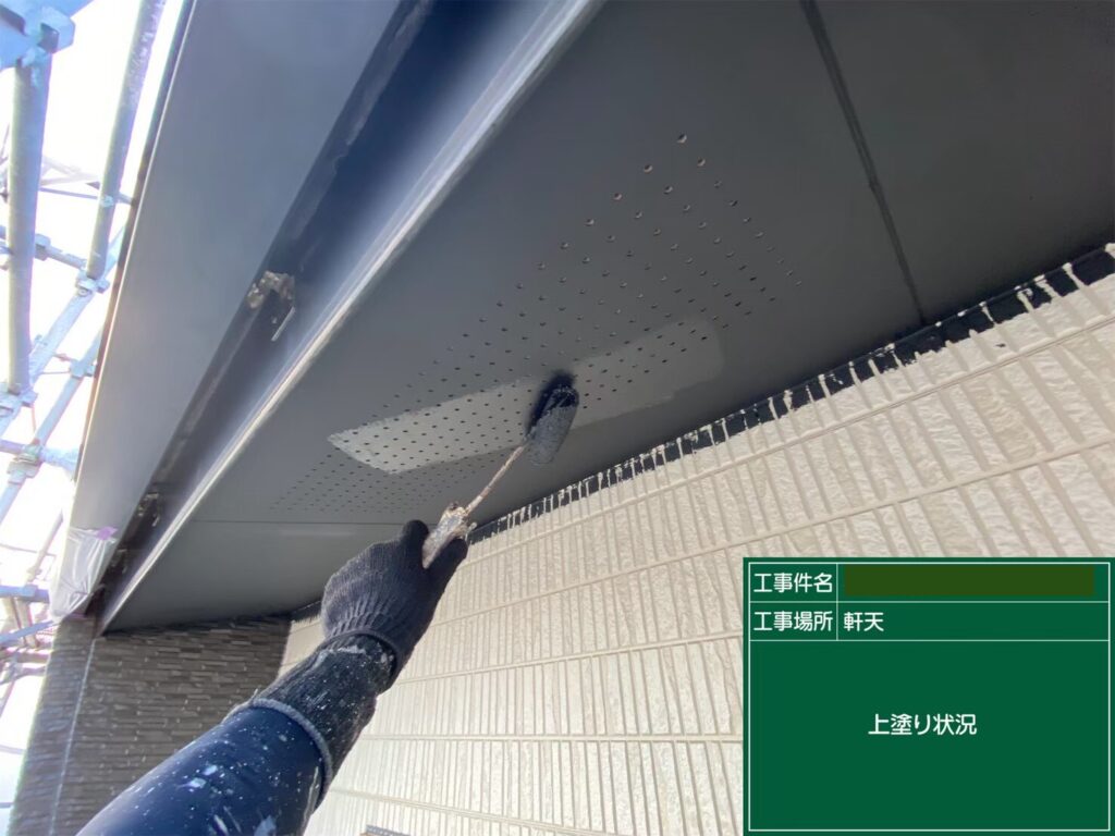 軒天は2回の上塗りで仕上げていきます。軒天には湿気が溜まりやすく、塗装の剥がれが起きやすい場所です。1回目で下地を整え、塗料との密着を良くしていきます。2回目で美観を整えながら塗膜の厚みを確保し、より強固に、美しく仕上げていきます。白やクリーム系で塗装されることの多い軒天ですが、今回はよりスタイリッシュな印象になるように、メイン色と同じチャコールで塗装しました。