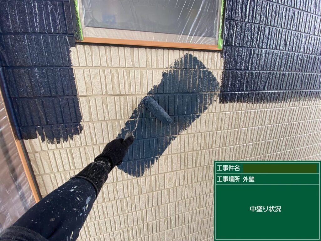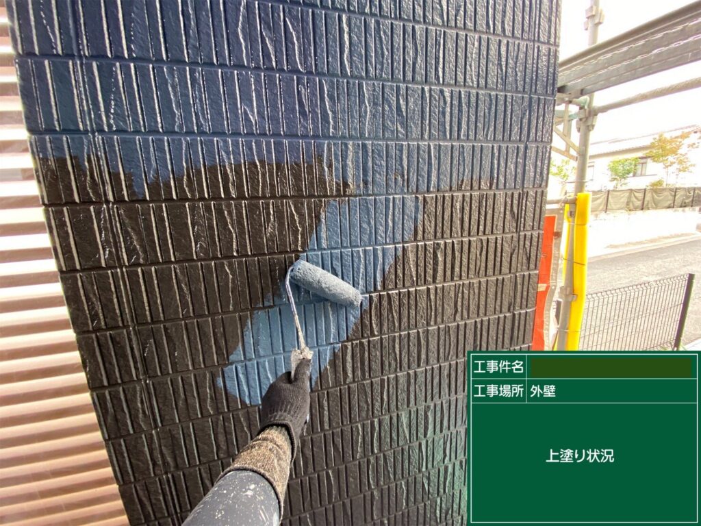 外壁塗装の工程は大きく分けて【下塗り】【中塗り】【上塗り】の工程に分けられます。下塗りでは外壁の表面が濡れたように見えるまで下塗り剤をしっかりとしみ込ませ、上塗り材の吸収を防止します。強固な塗装の土台をつくることが仕上げ塗料の密着性を高めて、耐久性のある塗膜形成につながります。下塗り乾燥後、中塗り➡上塗りと、仕上げ塗料を2層重ねていきます。使用塗料は屋根と同様に「リファインMF」お色は一番人気の【チャコール】と【ミネラルグレイ】のツートンです。