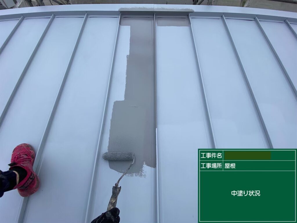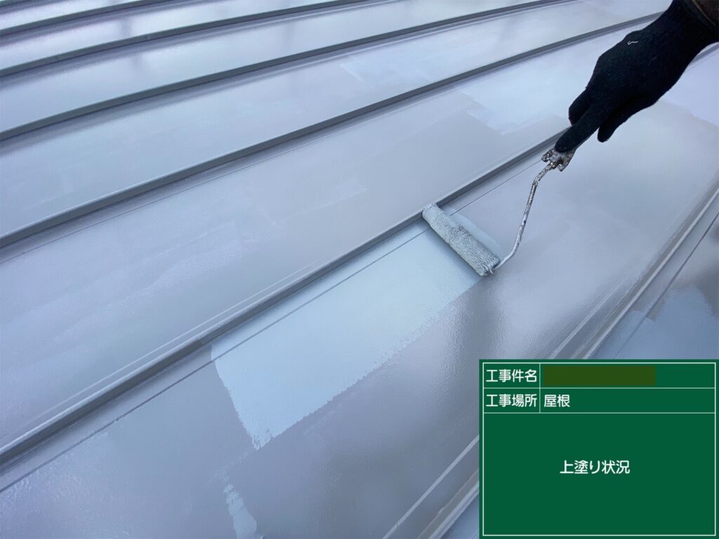 下地処理を終えたガルバリウムに、中塗り・上塗りと2回、仕上げ塗料を重ねていきます。下塗りに加えて塗膜が三層構造になることで、色の深みと艶を均一に整え、強固な塗膜により塗料の性能が最大限発揮される、寿命の屋根塗装が完成します。