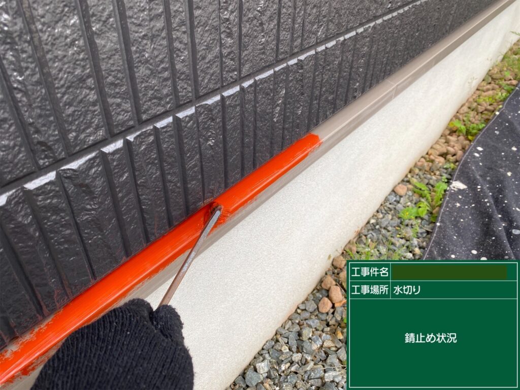 金属製の付帯部塗装は、まずケレン処理で汚れや錆びを取り除くことから始まります。サンドペーパー等を使って手作業で丁寧に実施します。その後、下塗りとして錆止めを塗装します。錆止めには、この先発生する可能性のある錆びを予防する効果と、現状発生している錆の進行を食い止める効果があります。錆びや錆だれを防ぐことも、お家の美観を長く保つための大切なポイントです。