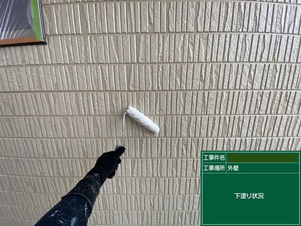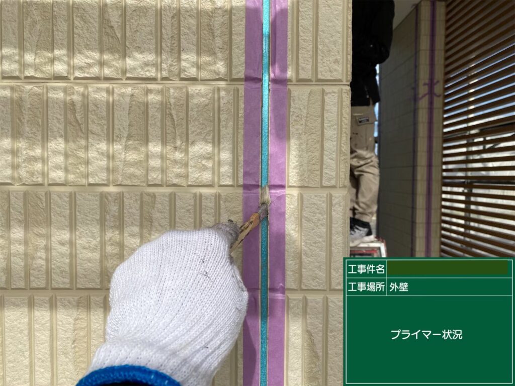 既存の劣化したコーキングを撤去後、目地の清掃をします。綺麗になった目地にプライマーを塗布していきます。プライマーはシーリング材と外壁をつなぐ接着剤の役割を担っています。隅々まで行き渡るように、刷毛で丁寧に塗布していきます。