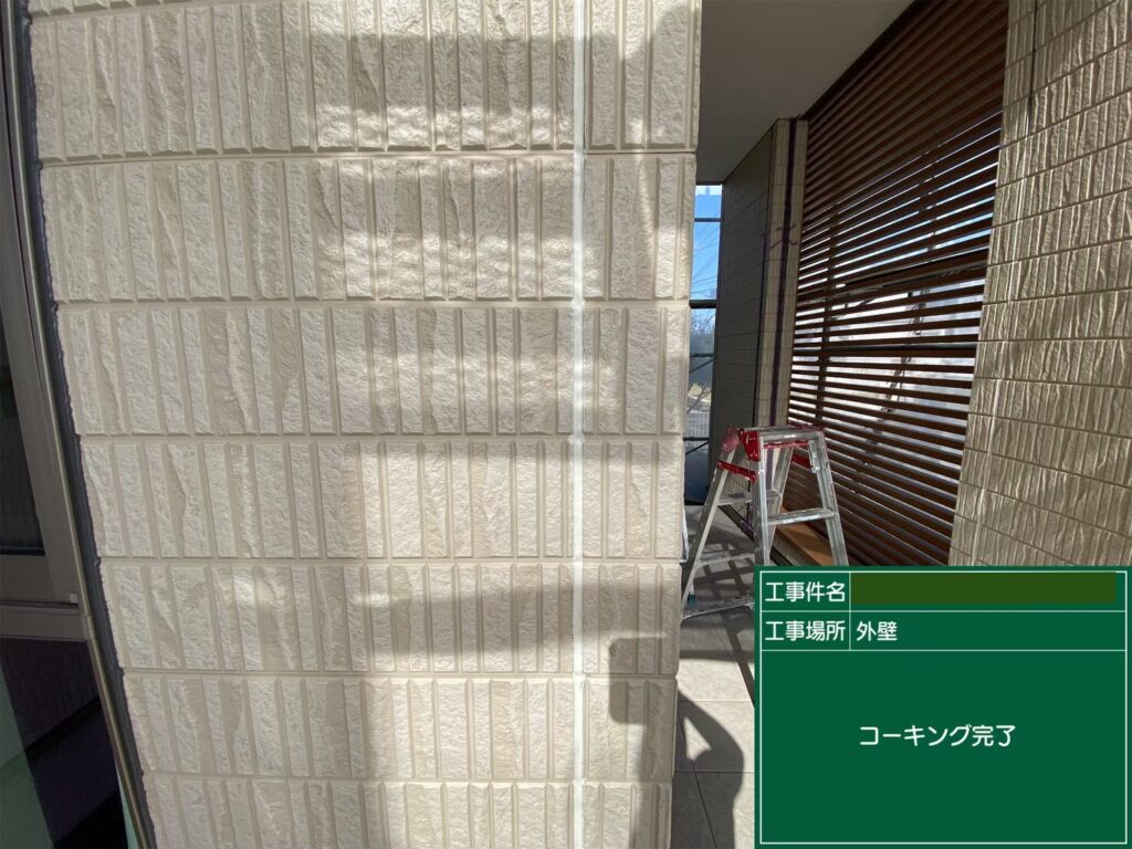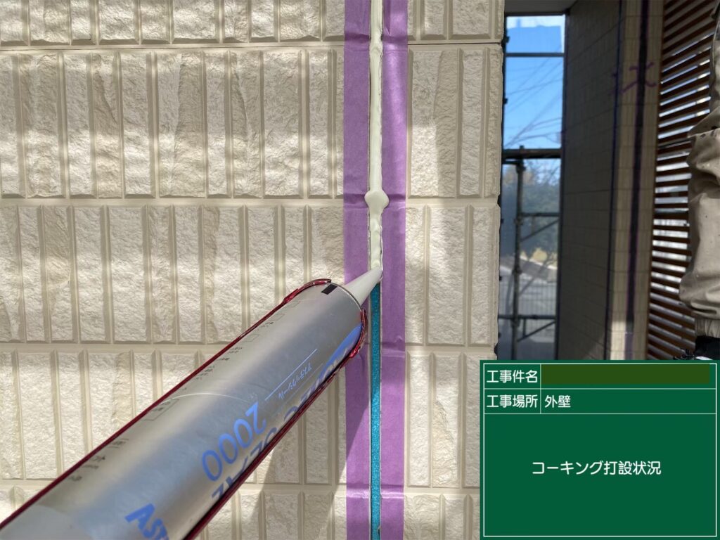 外壁の目地施工は、基本的には既存のコーキングを撤去し、新たに打ち替えを行います。写真にある紫のテープは養生、水色の部分はボンドブレーカーです。目地とコーキングの間にこのボンドブレーカーを挟むことで、コーキングと外壁の接地面が2面となり、外壁の伸縮等による動きに対し柔軟性を持ったコーキングにすることができます。もしこのボンドブレーカーを挟まずに施工すると接地面が3面となり、強固にはなりますが柔軟性を失い、ひび割れ等の劣化が起こりやすくなります。