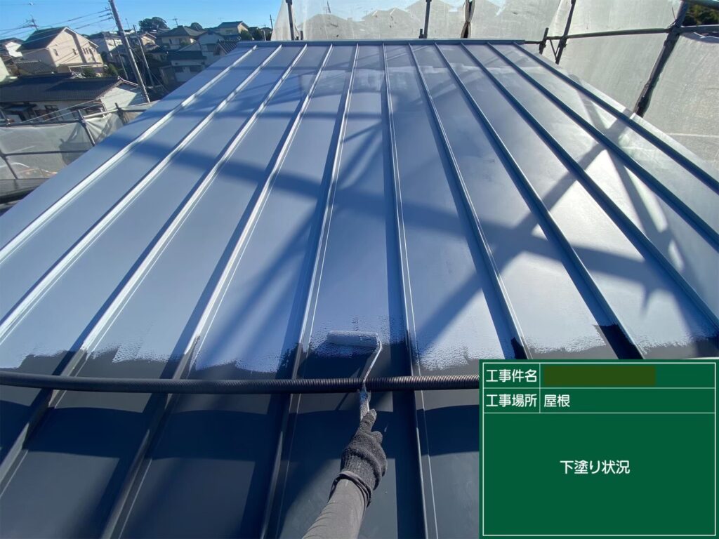 ガルバリウムは決して塗料の食いつきが良い素材ではないため、塗装の耐候性を発揮するには、下地処理が重要になってきます。まずはケレン処理で、ガルバリウムの表面に付着した汚れや、発生した錆びを落として行きます。また、この処理を行うことで表面に微細な傷を付けて、塗料との物理的な接地面積を広げることで、塗料の食いつきを良くしていきます。今後の錆の発生や、既存の錆の進行を止めるため、下地には錆止めを塗装していきます。