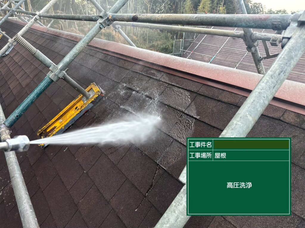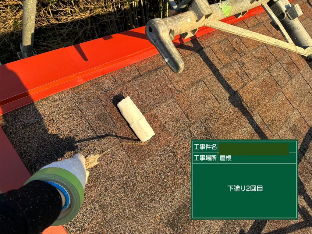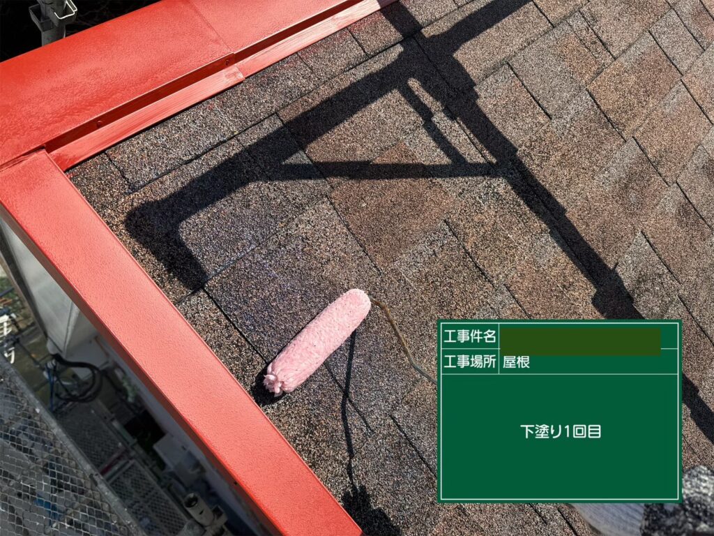 次に屋根の下塗りです。今回施工する屋根材は『アスファルトシングル』です。