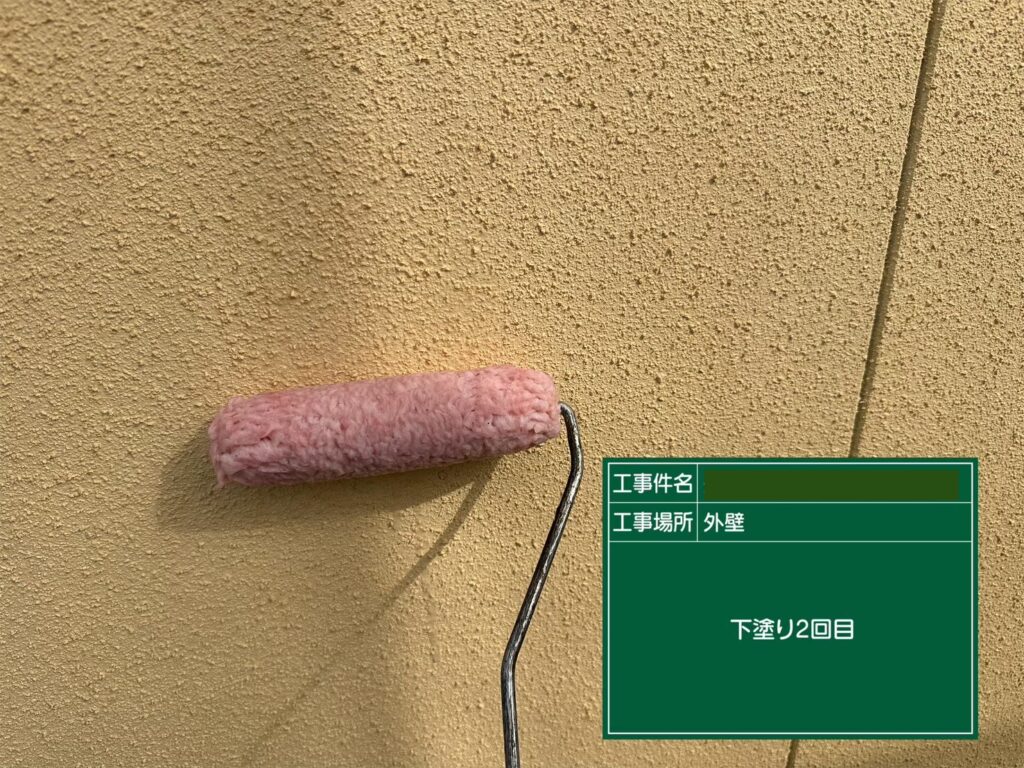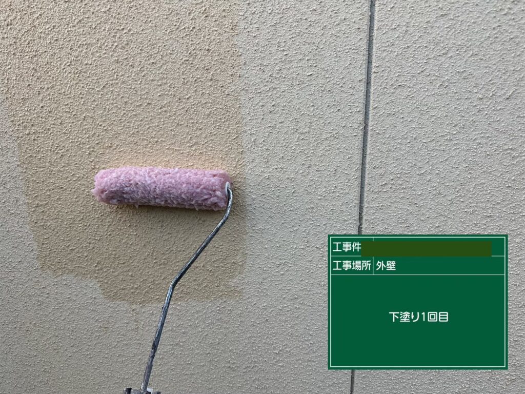 外壁塗装の工程です。まず「下塗り」は塗装の仕上がりや耐久性を決める重要な工程です。下塗りを省略すると、仕上げ塗料が外壁に十分に密着せず、さまざまなトラブルの原因となります。