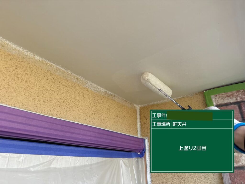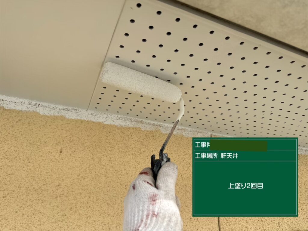 軒天の塗装は基本的に2回を行います。 軒天には、屋根からの雨水が直接壁面に当たるのを防ぎ、建物内部へ雨水の侵入を防ぐという大きな役割があります。2度の上塗りで、役割を果たすために十分な厚みのある塗膜をつくります。白系の明るい色で塗装することで、お家全体の印象が明るくなります。