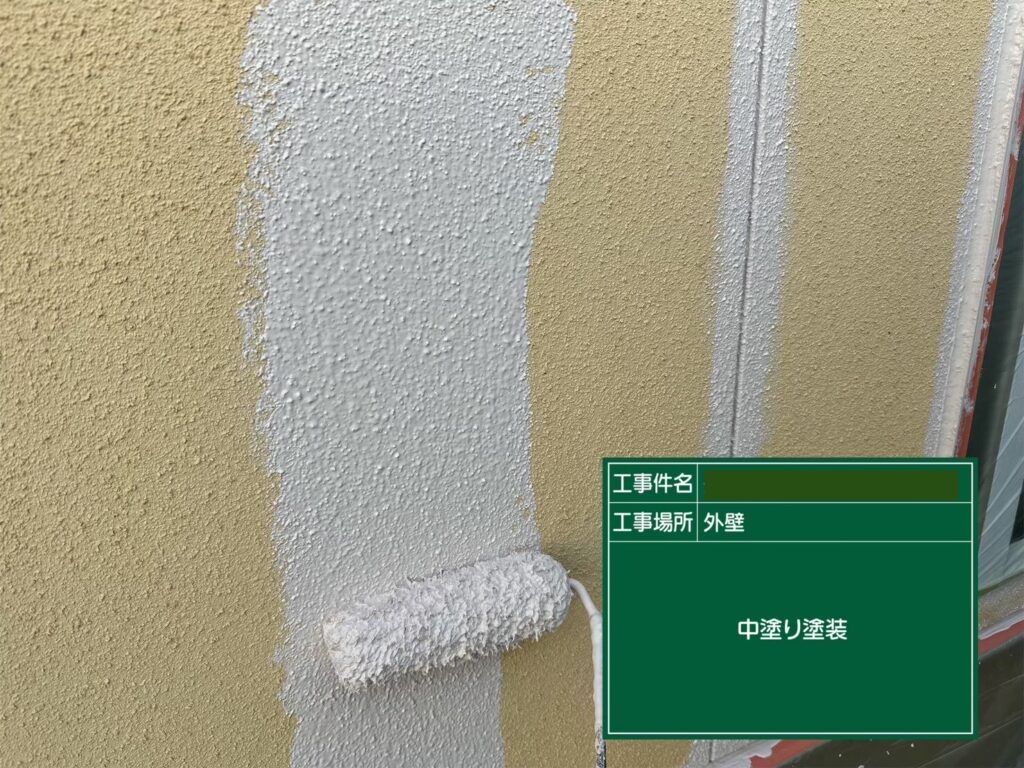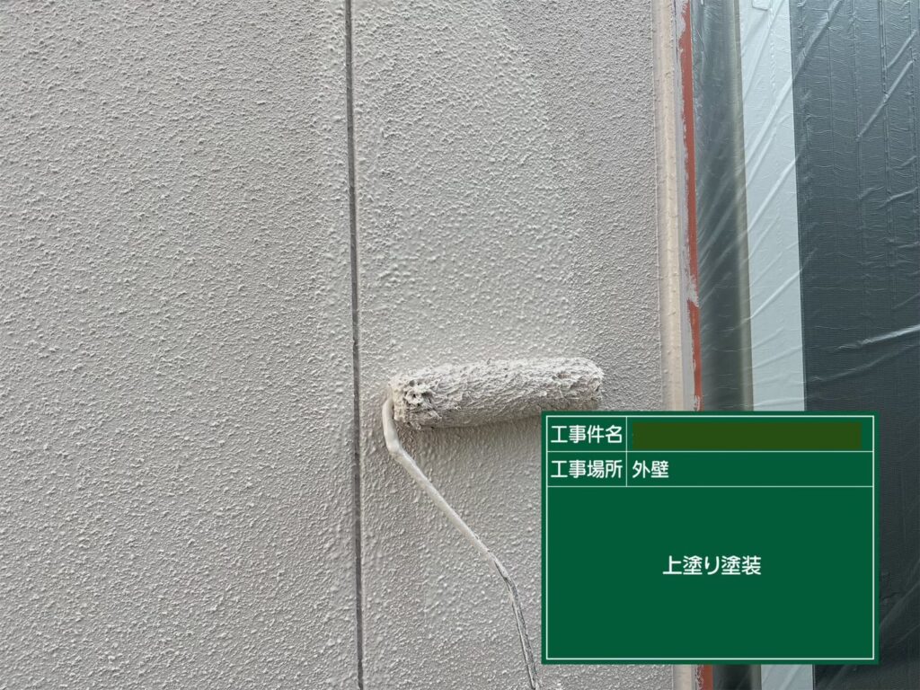 「中塗り」とは、下塗りと上塗りの間に行う塗装作業のことです。塗装面のムラや凸凹を均一に整えたり、塗料の耐久性・密着性を高めたりなど、より高品質な上塗り(仕上げ)にするためのサポート的な役割を持っています。最後に「上塗り」です。上塗りは外壁の見た目や保護性能を決定づける役割を持つため、全工程の中でも特に重要です。