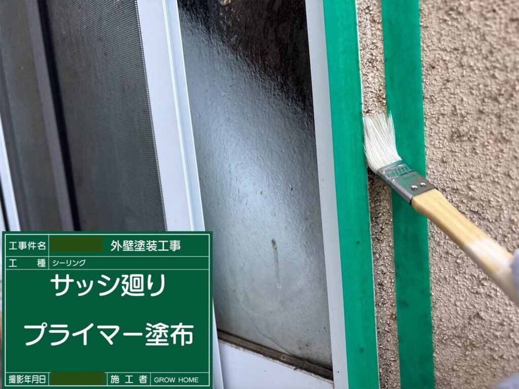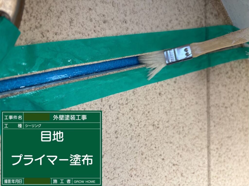 綺麗になった目地にプライマーを塗布していきます。プライマーはシーリング材と外壁をつなぐ接着剤の役割を担っています。隅々まで行き渡るように、刷毛で丁寧に塗布していきます。