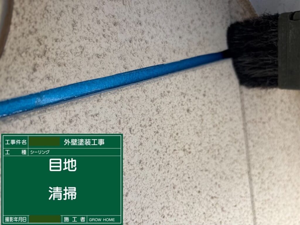 外壁の目地施工は、基本的には既存のシーリングを撤去し、新たに打ち替えを行います。写真にある紫のテープは養生、水色の部分はボンドブレーカーです。目地とシーリングの間にこのボンドブレーカーを挟むことで、シーリングと外壁の接地面が2面となり、外壁の伸縮等による動きに対し柔軟性を持ったシーリングにすることができます。もしこのボンドブレーカーを挟まずに施工すると接地面が3面となり、強固にはなりますが柔軟性を失い、ひび割れ等の劣化が起こりやすくなります。撤去後の目地は丁寧に清掃します。